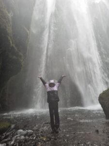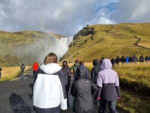 Later, the group visited the spectacular Seljalandsfoss waterfall, which cascades from high basalt cliffs along the Seljalandsá River. Standing at 65 metres tall, this waterfall is unique in that visitors can walk behind the curtain of water – a truly unforgettable experience.