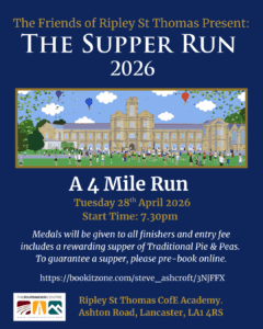 Medals and suppers to all finishers. Please pre-book to guarantee a supper! Enter online via bookitzone.com or please use this form (1 form per runner) and either place in a sealed envelope along with the entry fee in the ‘Friends Box’ in the school canteen or post to Lesley Kelly c/o Ripley St Thomas, Ashton Road, Lancaster, LA1 4RS.